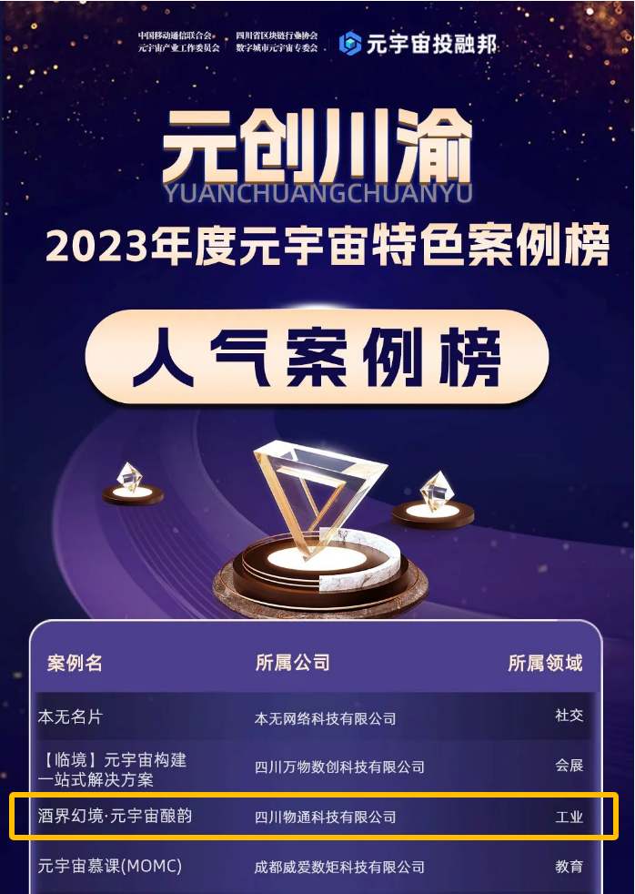 物通科技憑借其創(chuàng)新性的「酒界幻境·元宇宙釀韻」項(xiàng)目,成功入圍「元?jiǎng)?chuàng)川渝」2023年度元宇宙特色案例榜,并榮登“人氣案例榜”前三!